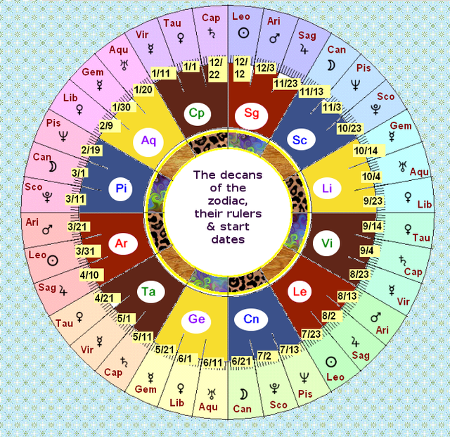 - ეგვიპტური ასტროლოგია არ ეფუძნებოდა 12 ზოდიაქოს ნიშანს, არამედ დეკანებს (Decans). დეკანი არის 36 ტოლნაწილად დაყოფილი წრე/დაფა რომელზეც დატანილია 36 უძრავი ციური სხეული/ვარსკვლავი. ამ დაფას ეგვიპტელები ძირითადად იყენებდნენ რელიგიური რიტუალების თარიღების გამოსათვლელად. ასევე დეკანებს ანიჭბდნენ ადამიანისთვის დამახასიათებელ თვისებებს. დეკანები პირველად გამოჩნდა ქრისტეს შობამდე 2000 წლით ადრე.